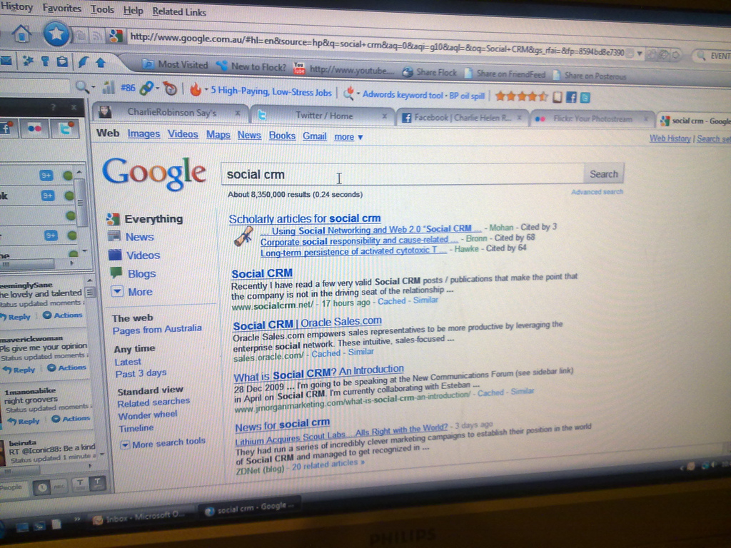 the callout came from Jeremiah basically from halfway around the globe – what do you see in google when you search for “social CRM”? this was my response (pic above posted to flickr). 44 views in less time than i could blink. xc