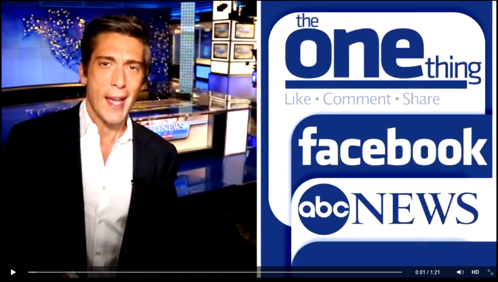 ABC News has introduced a social media newcast on Facebook hosted by the “World News Tonight” Anchor David Muir. Called Facecast; The One Thing, it airs daily on Facebook only as a summary of news of interest to this audience as well as trending topics via a behind the scenes shot at the ABC News headquarters in New York City.