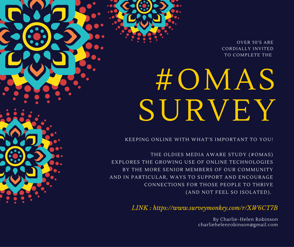 The Oldies Media Aware Study (#omas) explores the growing use of online technologies by the more senior members of our community and in particular, ways to support and encourage connections for those people to thrive (and not feel so isolated). #omas looks at the trends in social media for the demographic of people over 50. The information you provide is for research purposes only and a final report is released of data findings with no names mentioned.